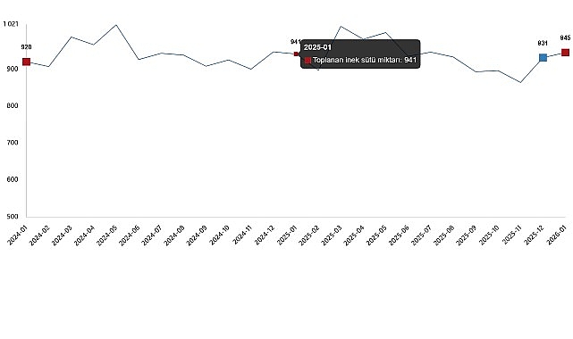 Bir önceki ay 930 bin 898 ton olan ticari süt işletmelerince toplanan inek sütü miktarı Ocak ayında %1,5 oranında artarak 944 bin 926 ton oldu.